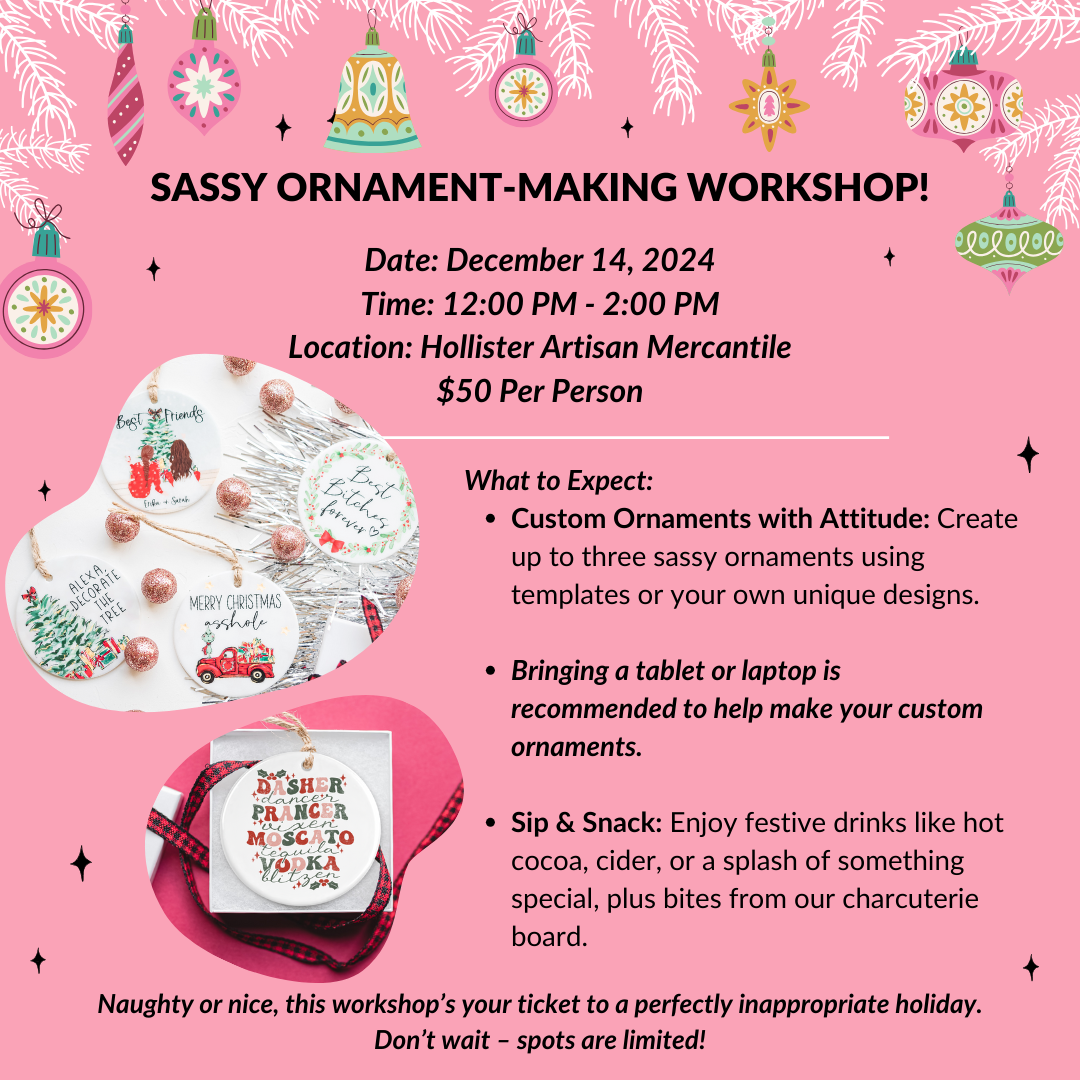 Join us for a Sassy Ornament-Making Workshop where we’re adding a cheeky twist to holiday decor. Bring your bold ideas and get ready for a festive time!