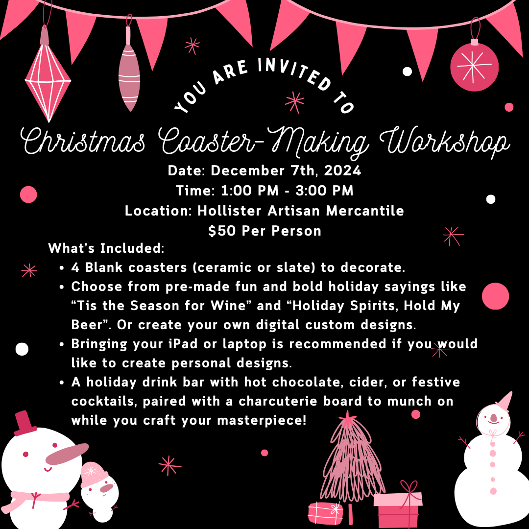 Get ready to sip, snack, and craft some serious holiday magic with us! We’re turning plain coasters into bold, festive masterpieces that’ll bring a little sass to your holiday decor.
